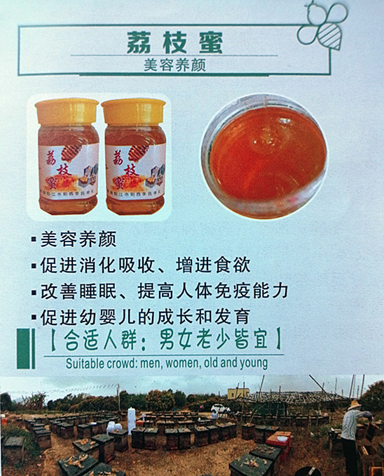 荔枝蜜芳香清甜,含有人体必须的多种维生素和营养成份,是老幼皆宜的天然保健食品。经现代医学研究证明,荔枝蜜所含的成份,能美容养颜,补血养血功效,对促进消化吸收、增进食欲、镇静安眠、提高人体免疫能力、促进幼婴儿的成长和发育有着积极的辅助作用。